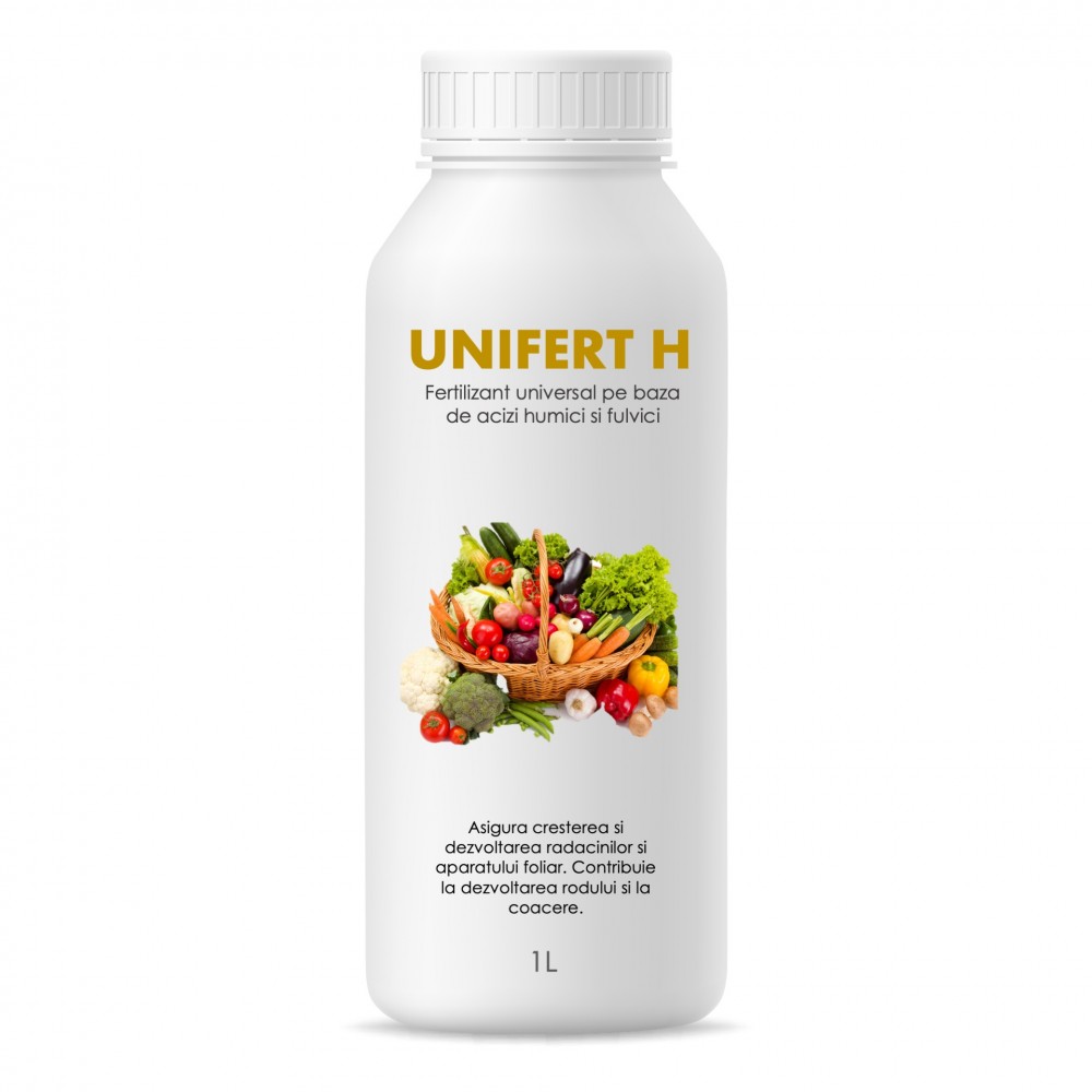 Biostimulator organic lichid pentru toate tipurile de culturi vegetale Unifert H, 1 litru imbunatațeste structura solului, creste retenția nutrienților si disponibilitatea acestora. Stimuleaza activitatea microbiologica din sol, mareste dezvoltarea radacinilor, Imbunatațeste preluarea fosforului si a metabolismului plantei. Mareste dezvoltarea foliajului si creste rezistența plantelor la stres. De asemenea datorita potsiului din substanțele humice contribuie In mod direct la dezvoltarea si coacerea rodului.